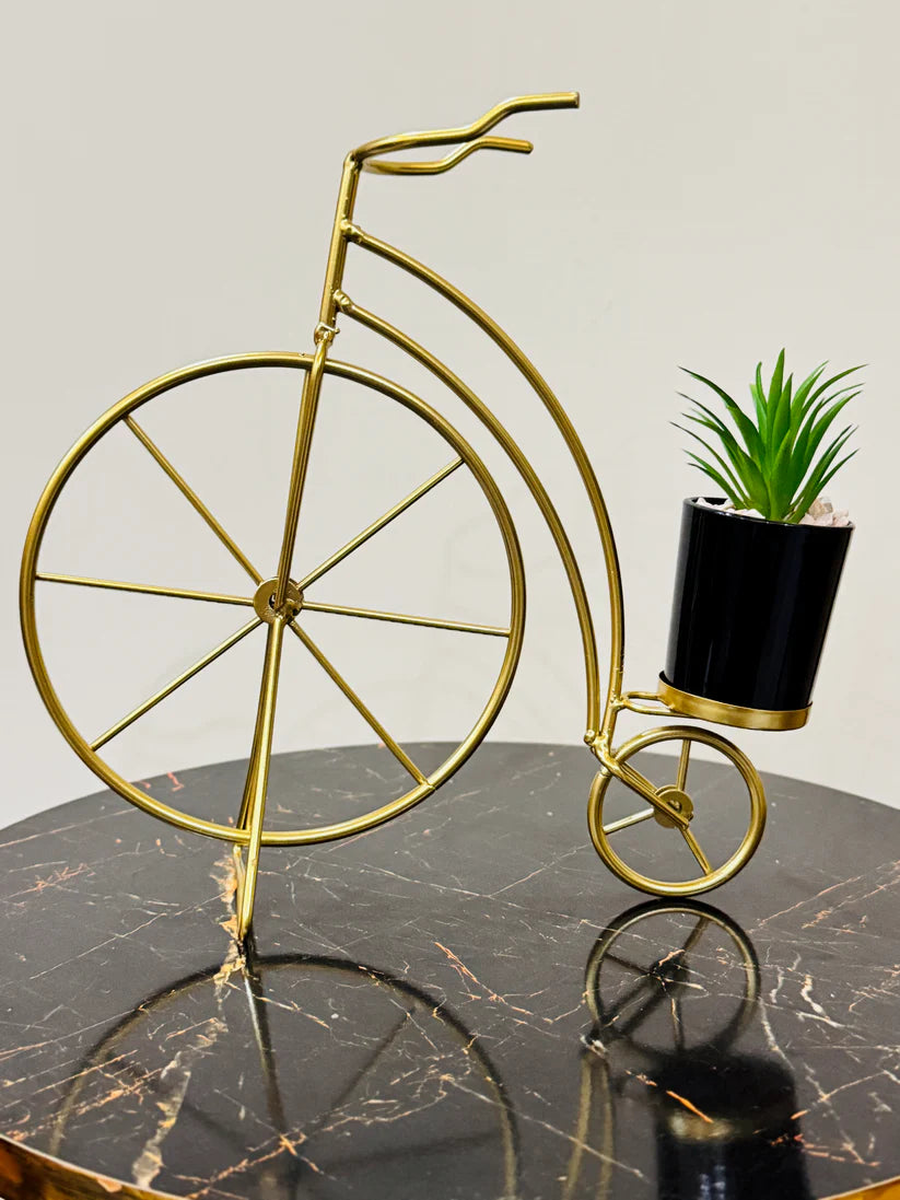 Add a touch of charm and elegance to your space with this stylish bicycle-shaped metal planter. Crafted from durable golden metal, this unique decorative piece holds a sleek black pot filled with a realistic-looking artificial succulent. Its compact and modern design makes it perfect for tabletops, office desks, shelves, or as a thoughtful gift.